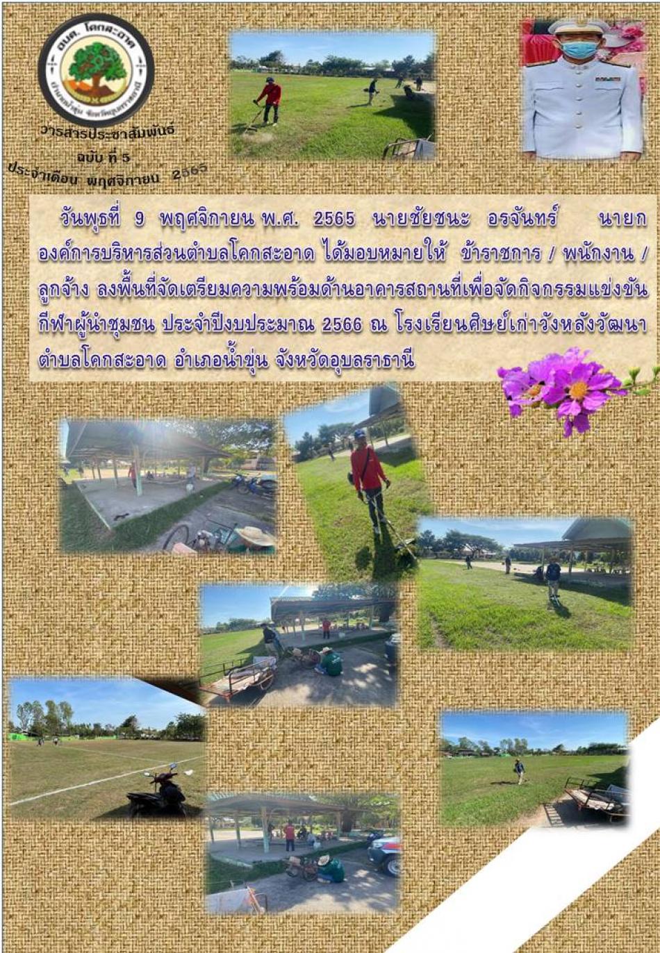 วันพุธที่ 9 พฤศจิกายน พ.ศ. 2565 นายชัยชนะ อรจันทร์ นายกองค์การบริหารส่วนตำบลโคกสะอาด ได้มอบหมายให้ ข้าราชการ / พนักงาน / ลูกจ้าง ลงพื้นที่จัดเตรียมความพร้อมด้านอาคารสถานที่ [9 พฤศจิกายน 2565]