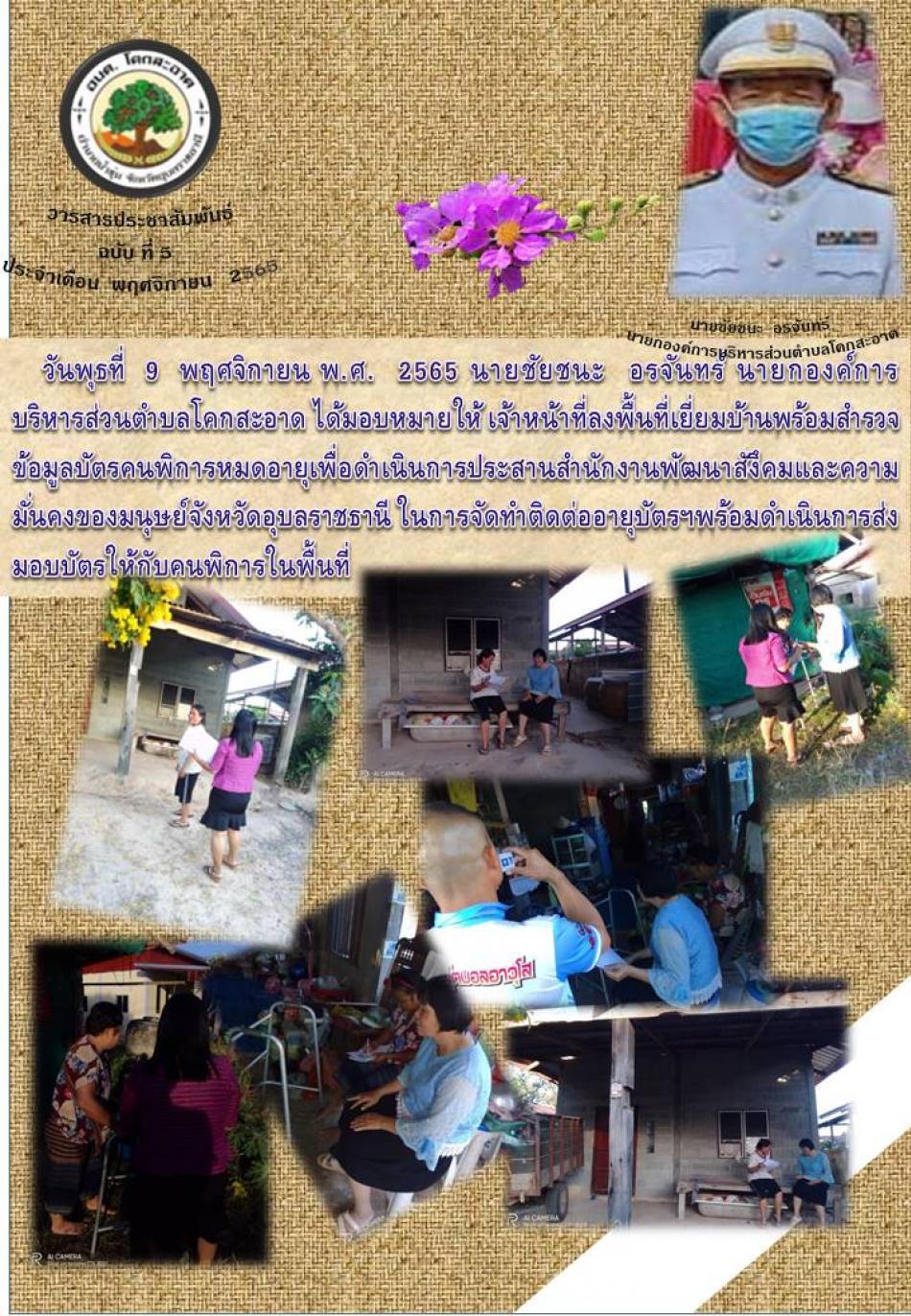 วันพุธที่ 9 พฤศจิกายน พ.ศ. 2565 นายชัยชนะ อรจันทร์ นายกองค์การบริหารส่วนตำบลโคกสะอาด ได้มอบหมายให้ เจ้าหน้าที่ลงพื้นที่เยี่ยมบ้านพร้อมสำรวจข้อมูลบัตรคนพิการหมดอายุ [9 พฤศจิกายน 2565]