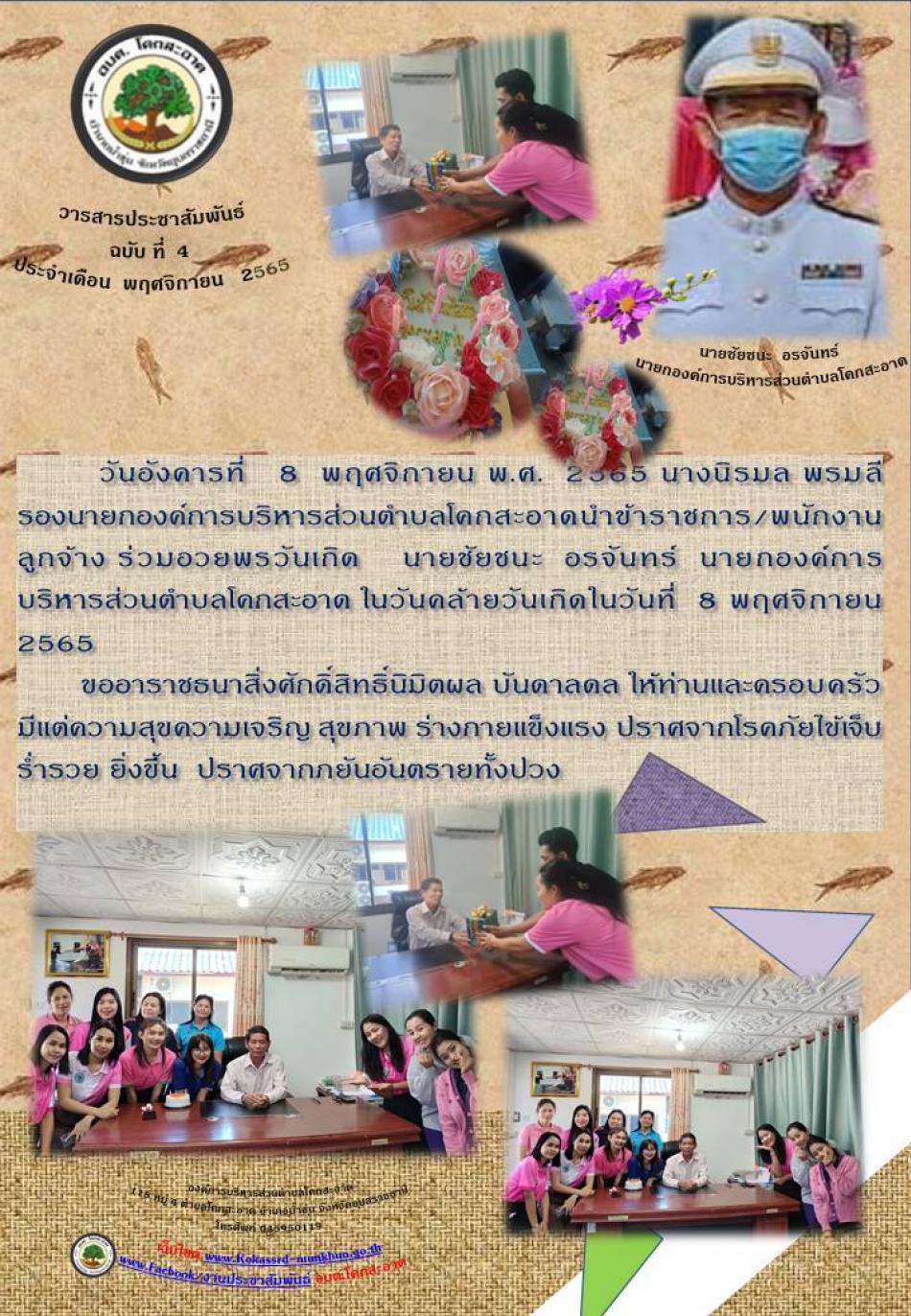 วันอังคารที่ 8 พฤศจิกายน พ.ศ. 2565 นางนิรมล พรมลี รองนายกองค์การบริหารส่วนตำบลโคกสะอาดนำข้าราชการ/พนักงาน ลูกจ้าง ร่วมอวยพรวันเกิด นายชัยชนะ อรจันทร์ นายกองค์การบริหารส่วนตำบลโคกสะอาด ในวันคล้ายวันเกิด [8 พฤศจิกายน 2565]
