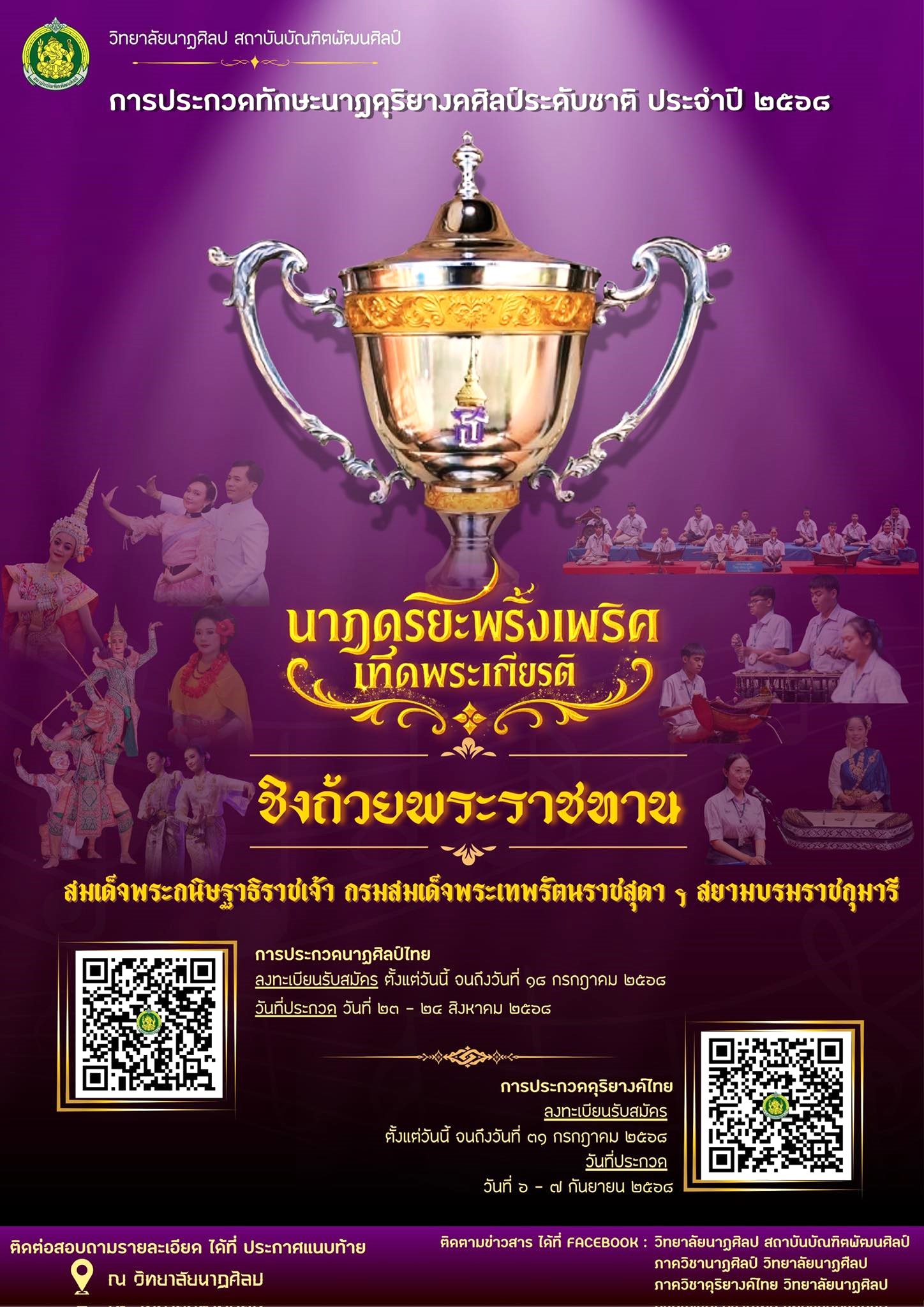 ชื่อเรื่อง : ขอเชิญชวน เข้าร่วมการประกวดทักษะนาฏดุริยางคศิลป์ระดับชาติ ชิงถ้วยพระราชทาน สมเด็จพระกนิษฐาธิราชเจ้า กรมสมเด็จพระเทพรัตนราชสุดา ฯ สยามบรมราชกุมารี “นาฏดุริยะพริ้งเพริศเทิดพระเกียรติ” ประจำปี พ.ศ. 2568 ซึ่งจัดโดยวิทยาลัยนาฏศิลป สถาบันบัณฑิตพัฒนศิลป์ กระทรวงวัฒนธรรม