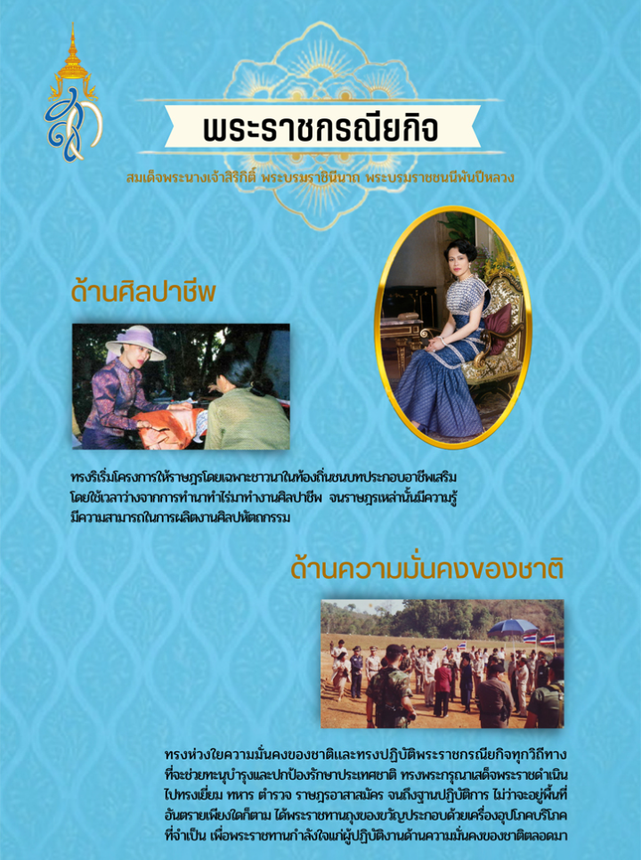 ชื่อเรื่อง : เนื่องในโอกาสวันเฉลิมพระชนมพรรษา ๑๒ สิงหาคม ๒๕๖๘ สมเด็จพระนางเจ้าสิริกิติ์ พระบรมราชินีนาถ พระบรมราชชนนีพันปีหลวง หน่วยราชการในพระองค์ ขอเผยแพร่พระราชกรณียกิจ “ทรงเชิดชูศิลปวัฒนธรรมไทย” เพื่อร่วมเฉลิมพระเกียรติและสำนึกในพระมหากรุณาธิคุณ